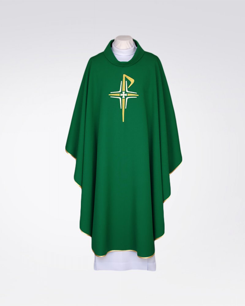 Ornat zdobiony haftem, wykończony złotą, brokatową lamówką. Kołnierz typu golf. Ornat wykonany z lekkiej, przewiewnej i przyjemnej w dotyku tkaniny o strukturze przypominającej len. Stuła wewnętrzna w komplecie. Szata dostępna również w innych kolorach liturgicznych.