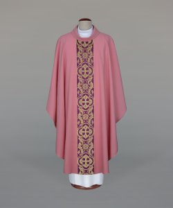 Ornat zdobiony eleganckim tkanym pasem, wykończony atłasową lamówką. Kołnierz typu golf. Ornat wykonany z lekkiej, przewiewnej i przyjemnej w dotyku tkaniny o strukturze przypominającej len. Stuła wewnętrzna w komplecie. Szata dostępna również w innych kolorach liturgicznych.