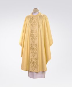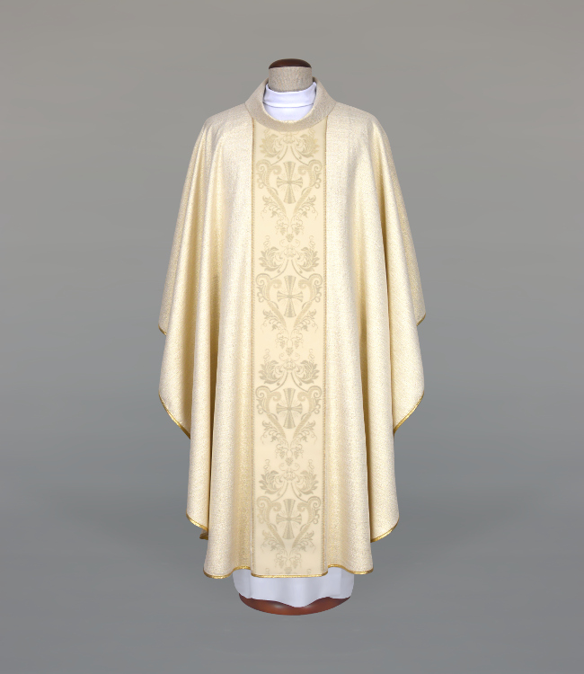 Ornat wykonany z lekkiej, brokatowej tkaniny w kolorze jasnegoota, zdobiony efektownym, tkanym pasem, wykończony złotą, brokatową lamówką. Kołnierz typu golf, stuła wewnętrzna w komplecie.