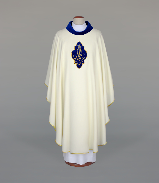 Ornat Maryjny zdobiony kombinacją haftu i aksamitnych aplikacji, wykończony złotą, brokatową lamówką. Kołnierz typu golf również z aksamitu. Całość wykonana z lekkiej, przewiewnej i przyjemnej w dotyku tkaniny o strukturze przypominającej len. Stuła wewnętrzna w komplecie.