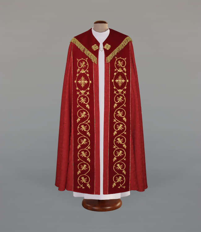 Kapa zdobiona bogatymi haftami na aksamitnych pasach i kołnierzu, wykonana z pięknej adamaszkowej tkaniny. Zapięcie na elegancką klamrę z łańcuszkiem, kołnierz wykończony ozdobnymi frędzlami. Stuła wewnętrzna w komplecie. Szata dostępna również w innych kolorach liturgicznych.